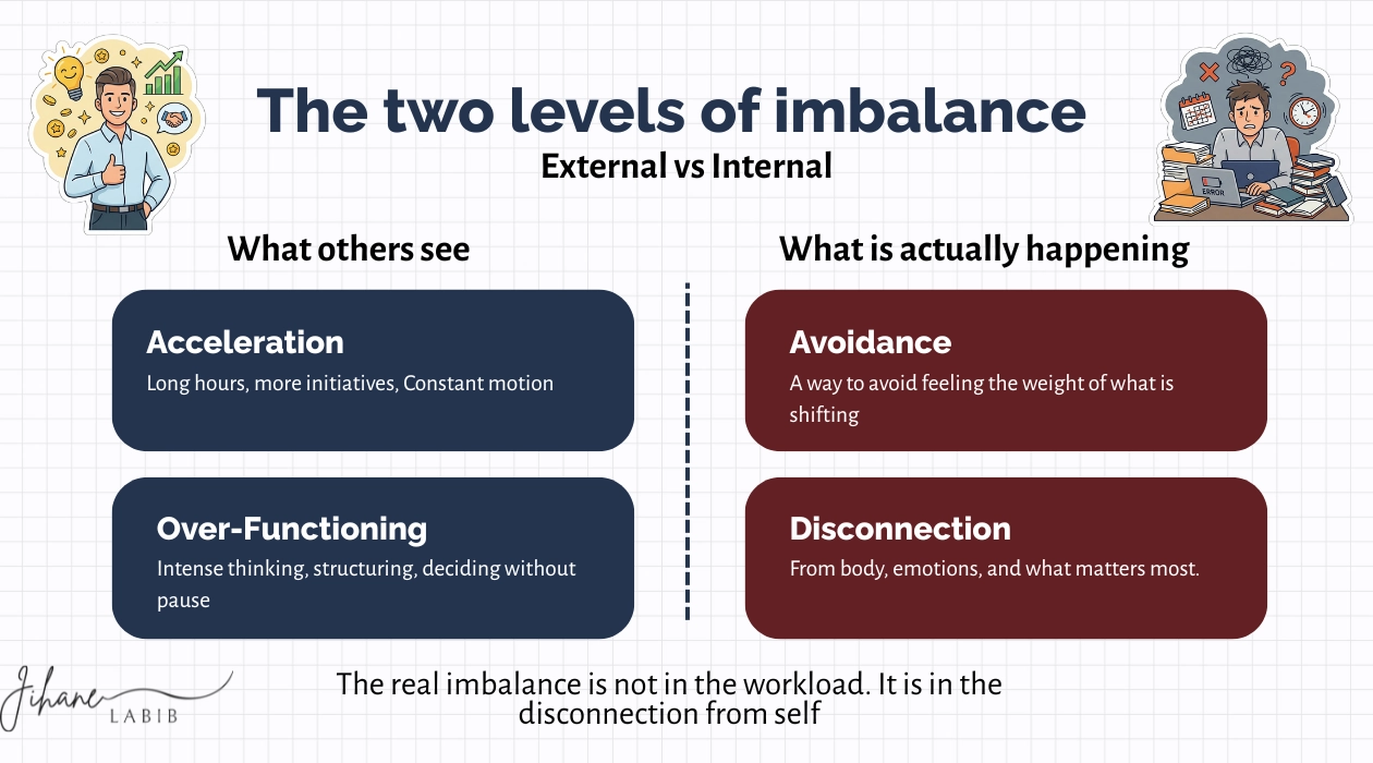 Externally, imbalance looks like acceleration. Longer hours, multiplied initiatives, constant motion. Some of this is strategic: in any crisis, some sectors grow while others stall. But for many leaders, the acceleration becomes something else. A way to stay busy. A way to avoid feeling the full weight of what is shifting around them.